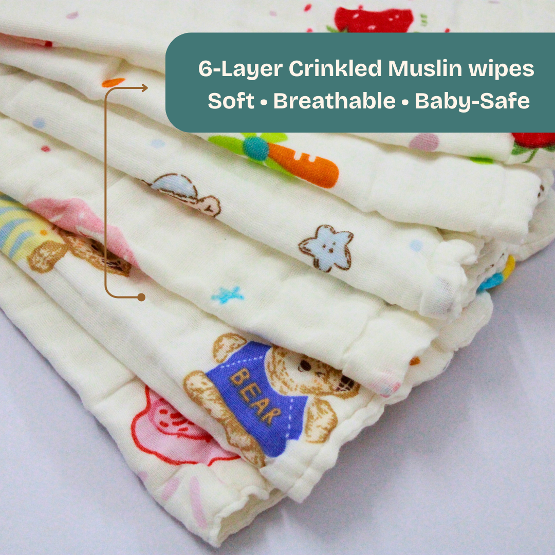 Made with 100% premium muslin cotton, our crinkled baby wipes are designed to provide ultra-soft, breathable, and safe cleaning for your little one’s delicate skin.