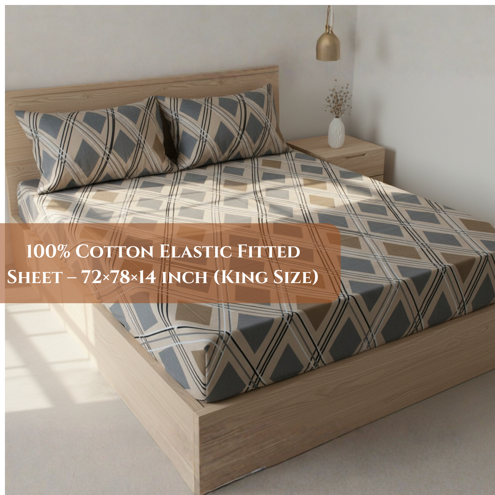 Give your bedroom a calm, modern makeover with our Beige Diamond Printed Cotton Elastic Fitted Sheet. Made from 100% breathable cotton with a 360° elastic grip that fits your mattress perfectly.