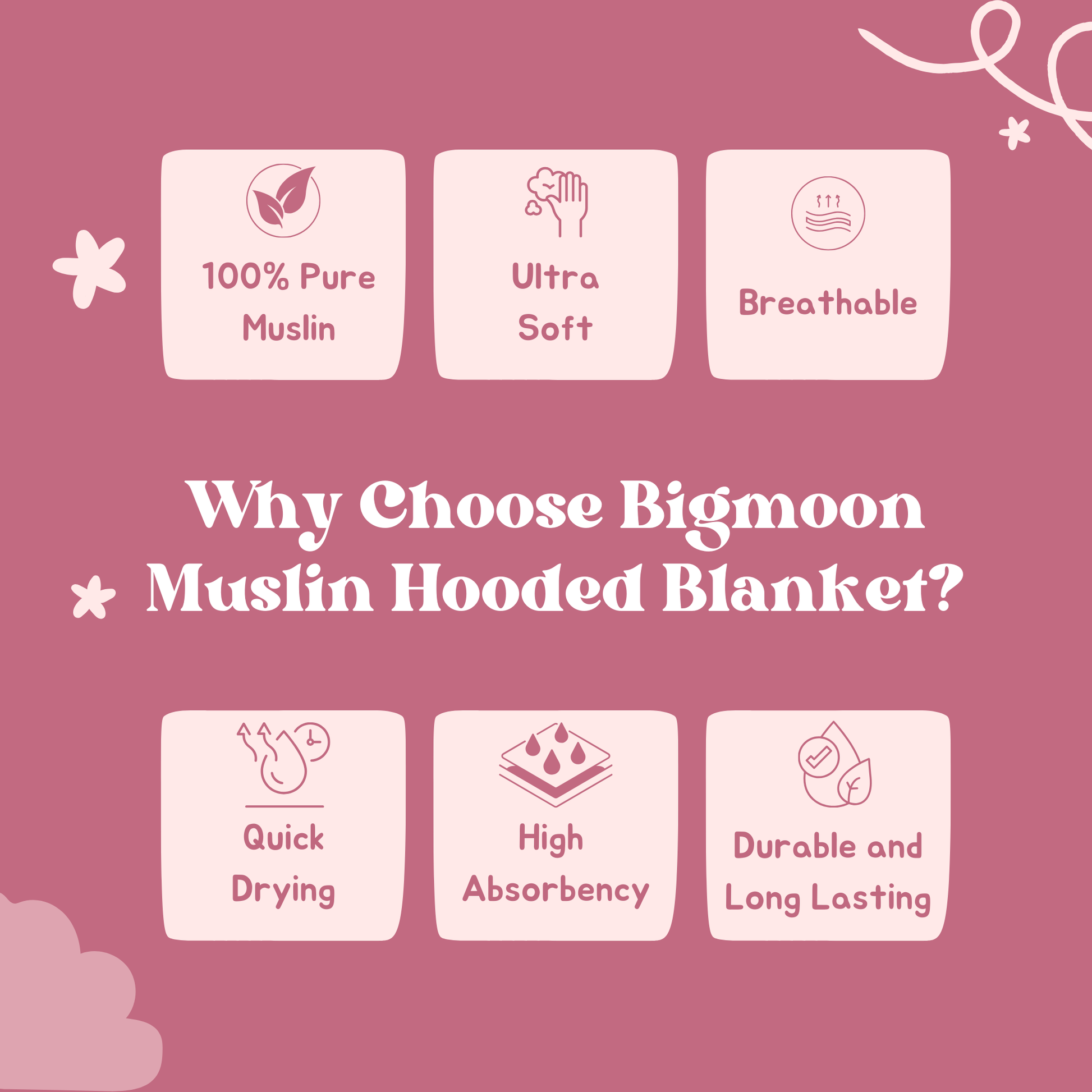 The Bigmoon Muslin Hooded Blanket for Newborn Baby is crafted from 100% premium muslin cotton with a soft double-layer weave, making it perfect for delicate newborn skin. Lightweight yet cozy, it keeps your baby comfortable without overheating.